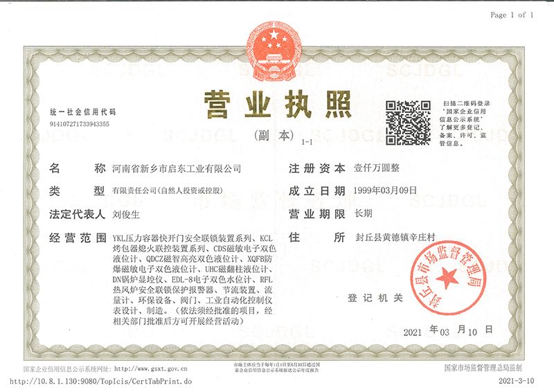 河南省新鄉(xiāng)市啟東工業(yè)有限公司始建于1987年,是專注研發(fā)、生產(chǎn)自動化儀器儀表(主要與壓力容器、鍋爐等容器配套使用)的廠家。主要產(chǎn)品有液位計(磁敏雙色型、磁翻柱型等)系列、烤包器熄火聯(lián)控裝置系列、壓力容器快開門安全聯(lián)鎖保護(hù)裝置系列、鍋爐報警器系列。二十多年來,公司產(chǎn)品暢銷國內(nèi)并遠(yuǎn)銷俄羅斯、蒙古與東南亞,深得廣大用戶的信賴和好評。我們多年來致力于自動化儀器儀表的研制生產(chǎn),公司現(xiàn)具有完善的生產(chǎn)、試驗、檢測手段和設(shè)備。科技創(chuàng)新、誠信服務(wù),是我們不變的經(jīng)營理念,我們將以強(qiáng)有力的技術(shù)支持及售后竭誠為客戶提供良好的服務(wù)。  2012年我公司成功研發(fā)了KCL系列烤包器熄火聯(lián)控裝置,并于2013年2月2日榮獲中華人民共和國國家知識產(chǎn)權(quán)局辦法的《實用新型**證書》<**號:2021202257735>該產(chǎn)品廣泛應(yīng)用于唐鋼等大型鋼鐵企業(yè),為烤包器安全作業(yè)提供了有力的保障。  2002年我公司成功研發(fā)磁敏電子雙色液位計獨(dú)特的高亮度LED紅綠雙色顯示,獲得了專家的首肯和用戶的一致好評。在此基礎(chǔ)上我公司研發(fā)人員十年磨一劍,致力于XQFB-1防爆型磁敏雙色液位計的研發(fā),于2013年12月27日由國家防爆電器產(chǎn)品質(zhì)量監(jiān)督檢驗中心檢驗合格并頒發(fā)防爆合格證書<編號:cnex19.0883>。該產(chǎn)品性能得到了充分的發(fā)揮,廣泛應(yīng)用于含有Ⅱ類A·B級T1-T4組可燃?xì)怏w或蒸汽與空氣混合形成的爆炸性混合物的0區(qū)、1區(qū)危險場所。連接用戶DCS或PLC系統(tǒng)實現(xiàn)遠(yuǎn)距離集中顯示和控制,從而實現(xiàn)節(jié)能、數(shù)字化管理。為用戶增加了一定的經(jīng)濟(jì)效益和社會效益,。2014年公司成功申請了夢潤儀表的logo,新的品牌新的形象,夢潤儀表是啟東的LOGO, 歡迎新老用戶前來洽談合作。  我們一如既往地注重科研的投入,憑借產(chǎn)品的不斷更新、加大科技含量,進(jìn)一步拓展市場。我們相信品質(zhì)成就未來,以過硬質(zhì)量、優(yōu)惠價格、完善的售后服務(wù)熱忱歡迎廣大客戶來我司視察指導(dǎo)、洽談業(yè)務(wù);精誠合作,共創(chuàng)輝煌!